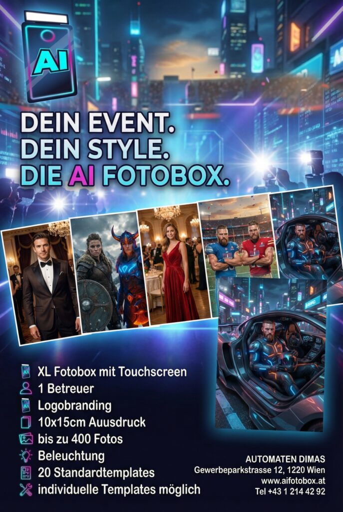 Möchtest du deine nächste Veranstaltung zu einem beeindruckenden Erlebnis machen? Unsere AI FOTOBOX ist der Schlüssel zu unvergesslichen Momenten und jeder Menge Spaß! Ob Hochzeit, Jubiläum, Geburtstag oder Firmenfeier – diese Fotobox sorgt dafür, dass deine Gäste die Zeit ihres Lebens haben!